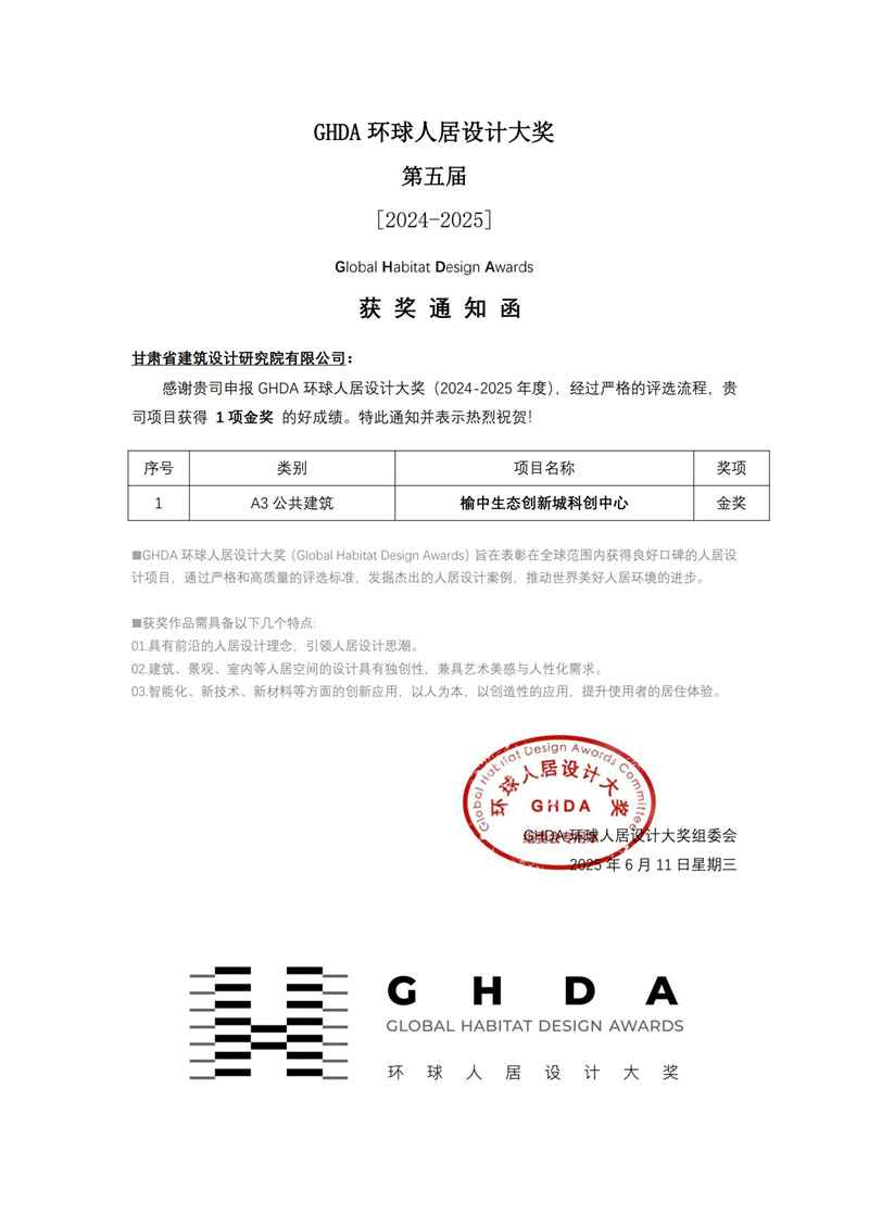 近日,備受矚目的第五屆GHDA環(huán)球人居設(shè)計(jì)大獎獲獎名單揭曉。甘肅工程咨詢集團(tuán)旗下省建筑設(shè)計(jì)院精心打造的榆中生態(tài)創(chuàng)新城科創(chuàng)中心項(xiàng)目,繼榮獲美國綠色建筑委員會頒發(fā)的LEED V4 BD+C鉑金級預(yù)認(rèn)證、中國綠色建筑三星級預(yù)評價(jià)兩項(xiàng)權(quán)威認(rèn)證后,再度摘得公共建筑類金獎,彰顯出我省在人居設(shè)計(jì)領(lǐng)域的卓越實(shí)力。