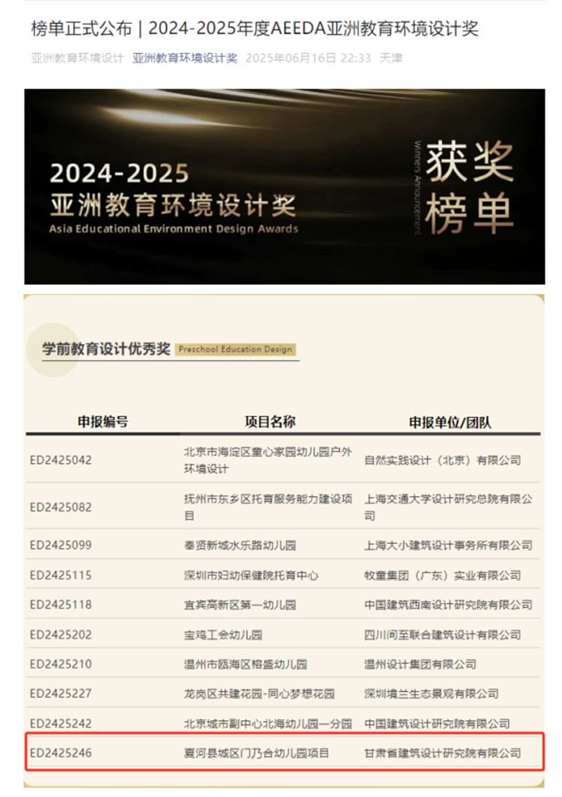近日,備受矚目的2024-2025年度AEEDA亞洲教育環境設計獎(Asia Educational Environment Design Awards)獲獎名單正式揭曉。由甘肅工程咨詢集團旗下省建筑設計院設計的夏河縣城區門乃合幼兒園項目,從百余件參賽作品中脫穎而出,榮膺學前教育設計領域優秀獎,為甘肅建筑設計行業贏得了國際聲譽。