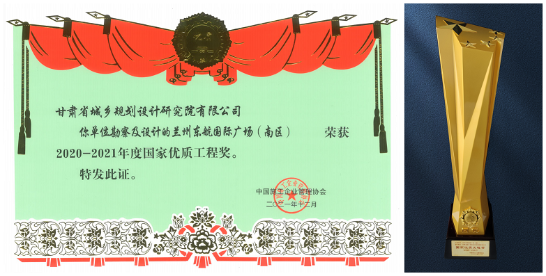 甘肅省城鄉規劃設計研究院勘察、設計的“蘭州東航國際廣場(南區)項目”榮獲“2020—2021年度國家優質工程獎”。此前,該項目已榮獲2020年工程建設項目綠色建造設計水平評價三等成果、2020年度甘肅省優秀工程勘察設計三等獎等多項榮譽。