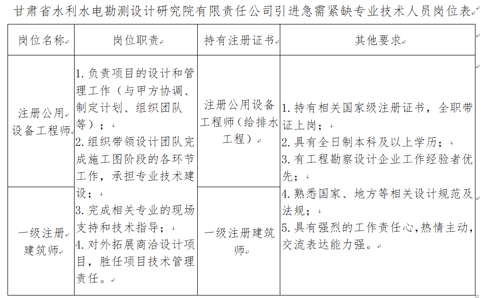 本次引進的具體崗位及資格條件詳見《甘肅省水利水電勘測設計研究院有限責任公司引進急需緊缺專業技術人員崗位表》(附件1)。