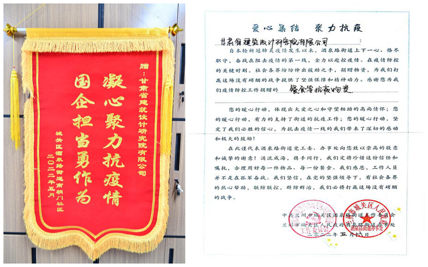 5月16日,甘肅省建筑設計研究院有限公司收到了來自蘭州市城關區(qū)酒泉路街道送來的感謝錦旗,錦旗上書寫著“凝心聚力抗疫情 國企擔當勇作為”。建筑設計院黨委書記李向軍、總經(jīng)理曹慶、紀委書記丁永升及黨群工作部相關負責人接待來訪。