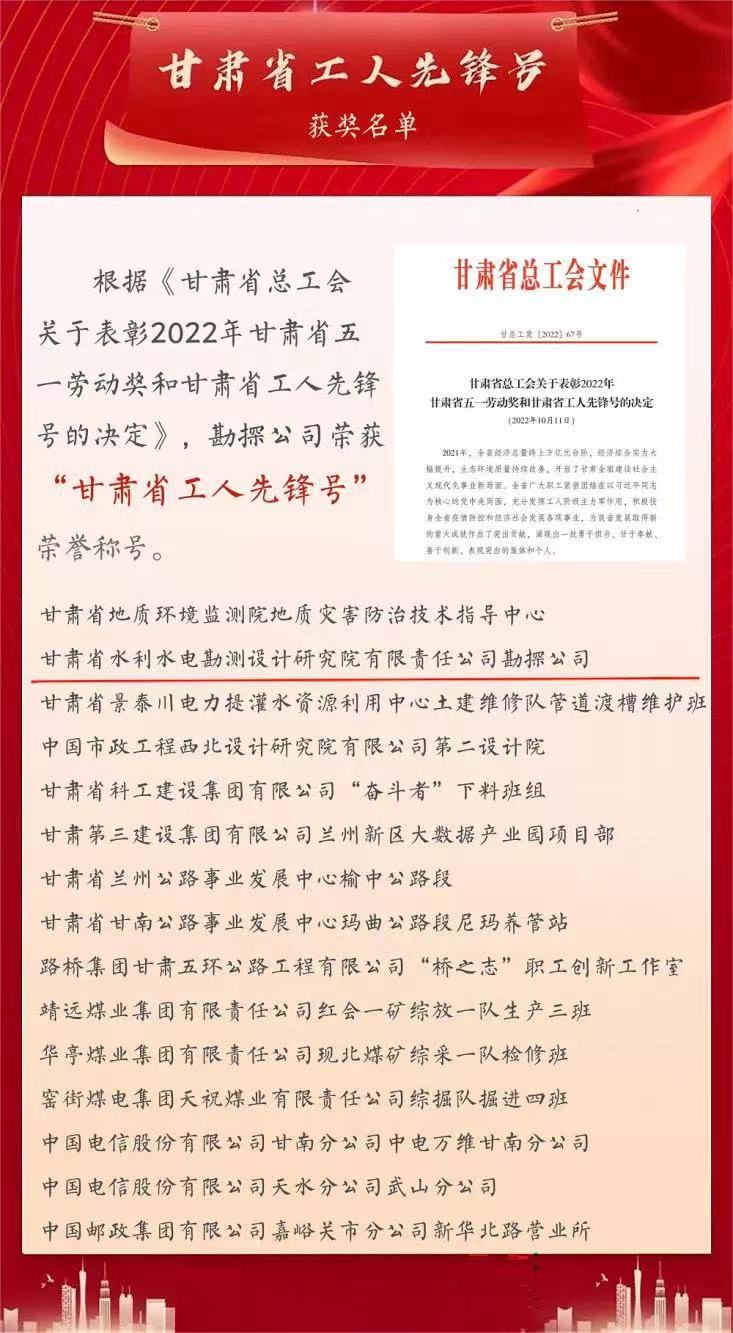 近日,甘肅省總工會(huì)發(fā)布2022年度“甘肅省工人先鋒號(hào)”和“甘肅省創(chuàng)新型班組”名單,甘肅省水電設(shè)計(jì)院的勘探公司榮獲2022年度“甘肅省工人先鋒號(hào)”稱號(hào),工程設(shè)計(jì)二院榮獲“甘肅省創(chuàng)新型班組”榮譽(yù)稱號(hào)。