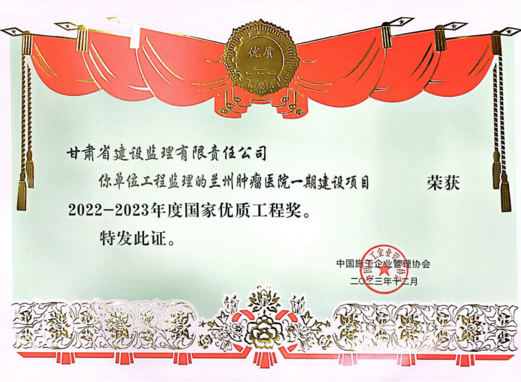 近日,經中國施工企業管理協會評審,省建設監理公司監理的蘭州腫瘤醫院一期建設項目榮獲2022-2023年度國家優質工程獎。此前,該項目已先后榮獲甘肅省建設工程文明工地、2021-2022年度甘肅省建設工程飛天獎、2022-2023年度國家優質工程獎。