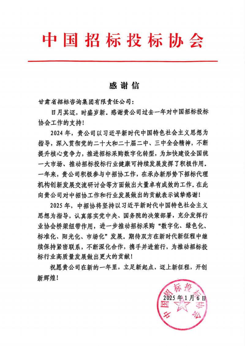 近日,省招標(biāo)集團收到來自中國招標(biāo)投標(biāo)協(xié)會(下稱“中招協(xié)”)的感謝信,感謝省招標(biāo)集團作為中招協(xié)常務(wù)理事單位為招標(biāo)投標(biāo)行業(yè)發(fā)展作出的積極貢獻。
